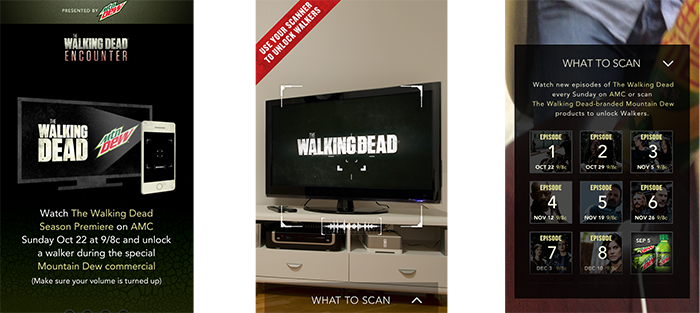 1. Scan the TV when the Mountain Dew commercial is on air and from each episode of the Walking Dead, fans can collect a new walker.