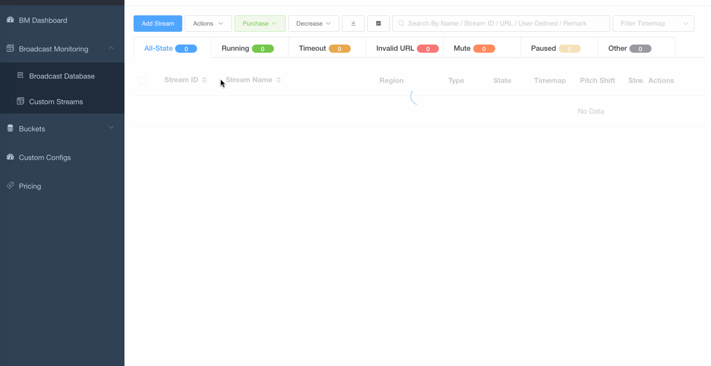 Create a “Custom Streams” project under “Broadcast Monitoring” and select “Monitor streams on ACRCloud” under “Broadcast Monitoring Type”, attach the bucket named “ACRCloud Music” and select the DSPs or codes if you want to have those DSPs’ IDs, ISRC and UPC in the monitoring results and click “Confirm” as the following image shows.