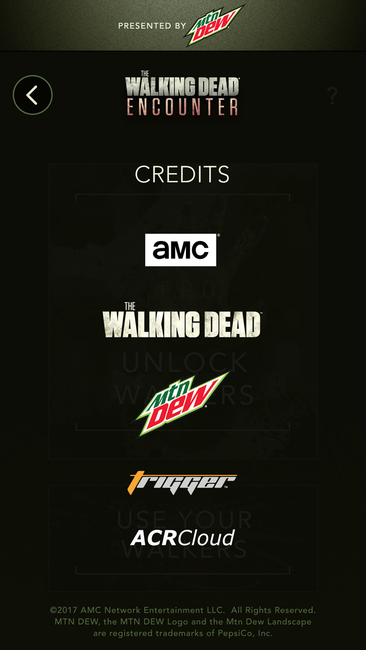 AMC & Mountain Dew’s co-branded app, The Walking Dead Encounter has been launched along with the series The Walking Dead Season 8 from OCT. 22 to Dec. 10. Fans can interact with the shows by scanning the Mountain Dew commercials aired during each week’s live episode to unlock new walkers using ACRCloud audio recognition technology.